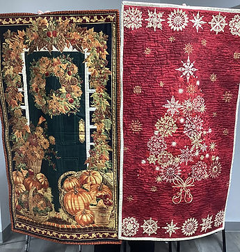 Christmas items: placemats, trees to hang on the door, table runners, advent calendar, buttoned jewellery bags, zippered bags and coasters.
